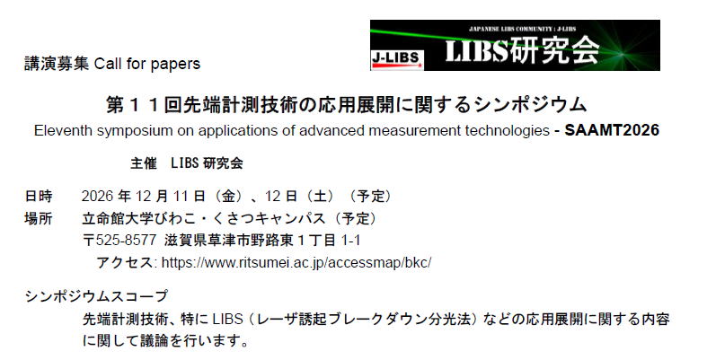 LIBS(レーザー誘起ブレークダウン分光: Laser-induced breakdown spectroscopy)は、パルスレーザー光を測定対象物質に集光照射してプラズマを発生させて、そのプラズマの発光を解析することで、測定対象物質の組成を分析する技術です。この技術は、分析に必要な前処理が最小限で済み、さまざまな環境やガス雰囲気で気体・液体・固体を迅速にその場で分析することができることから、鉄鋼、電力、原子力、海底資源探査、火星探査等、幅広い分野での応用が期待されています。 LIBSの発展には、レーザーアブレーション過程にかかる研究アプローチ、レーザー・計測における先進的機器および手法の開発、産業応用に向けた開発など、基礎から応用まで複数分野の学術的視点が求められています。本会は、さまざまな分野で活動する研究者・産業界の最新知見に基づいた横断的な連携強化を図り、情報交換・情報発信の場を提供することで、LIBS研究をより一層発展させることを目的として活動しています。 本会の活動として、国内では2013年から毎年、LIBSを主たるテーマとした「先進計測技術の応用展開に関するシンポジウム」を開催しています。国際会議では、2017年8月アジア地区LIBS会議(ASLIBS2017, 徳島市)、また2020年9月には世界最大のLIBS会議である11th International Conference on Laser-Induced Breakdown Spectroscopy (LIBS2020)を、日本主催でオンライン開催しました。さらに2023年6月にCSIとの共催としてアジア地区LIBS会議(CSI XLIII & ASLIBS2023, 徳島市)を開催し、2024年12月には事後会議(Post-CSI/ ASLIBS2023&SAAMT2024, 福井市)が開催されました。 栗原 一嘉(2025-2026 LIBS研究会代表)